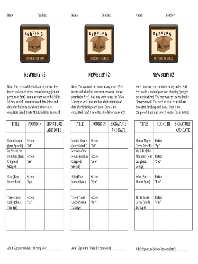 Name: ___ Teacher: ___Name: ___ Teacher: ___Name: ___ Teacher: ___NEWBERY #2NEWBERY #2NEWBERY #2Note: You can read the books in any order. Feel free to add a book of your own choosing (just get permission