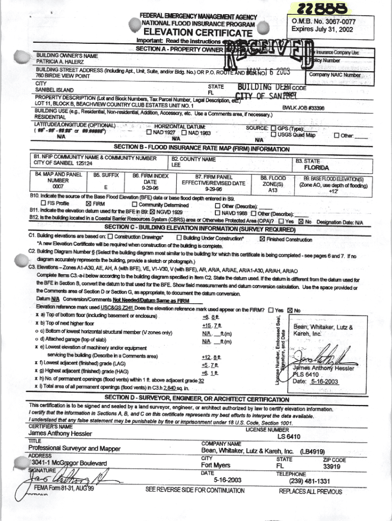 22 BeeFEDERAL EMERGENCY MANAGEMENT AGENCYO. M. B. No. 3067 0077NATIONAL FLOOD INSURANCE PROGRAMExpires July 31, 2002ELEVATION CERTIFICATE ImportantRead the instructions , .SECTION A PROPERTY.avrgi0