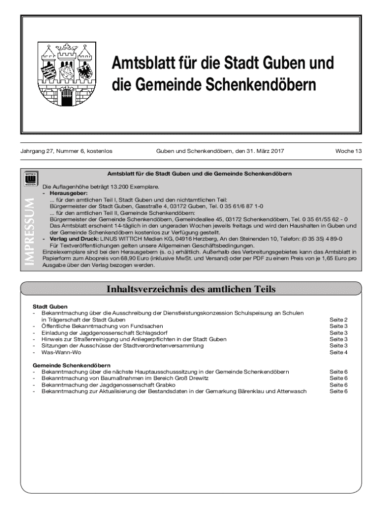 Amtsblatt fr die Stadt Guben und die Gemeinde SchenkendbernJahrgang 27, Nummer 6, kostenlosGuben und Schenkendbern, den 31. Mrz 2017Woche 13IMPRESSUMAmtsblatt fr die Stadt Guben und die Gemeinde Schenkendbern