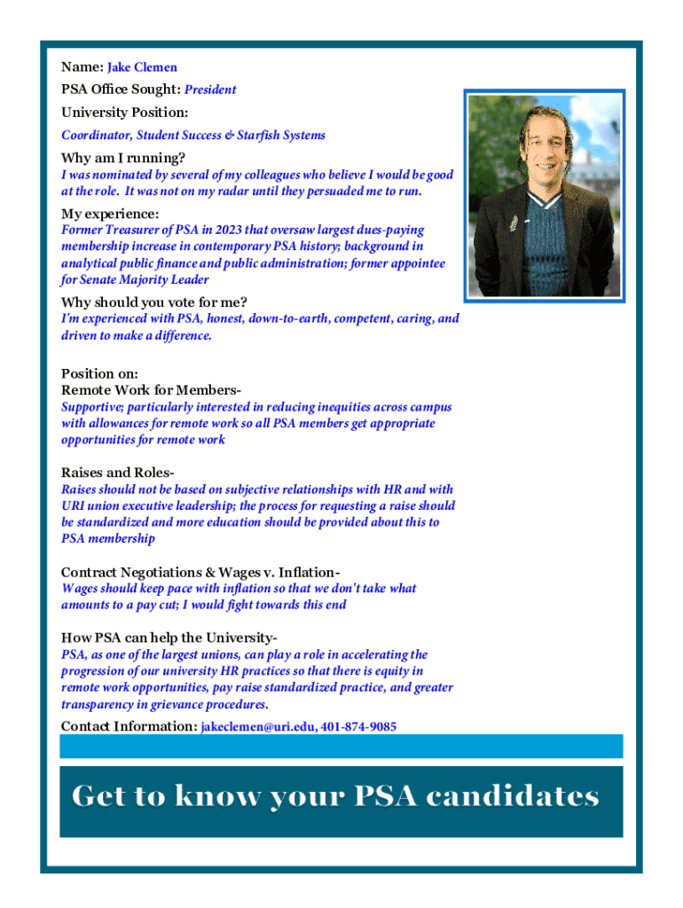 Name: Jake Clemen PSA Office Sought: President University Position: Coordinator, Student Success & Starfish Systems Why am I running? I was nominated by several of my colleagues who believe I would