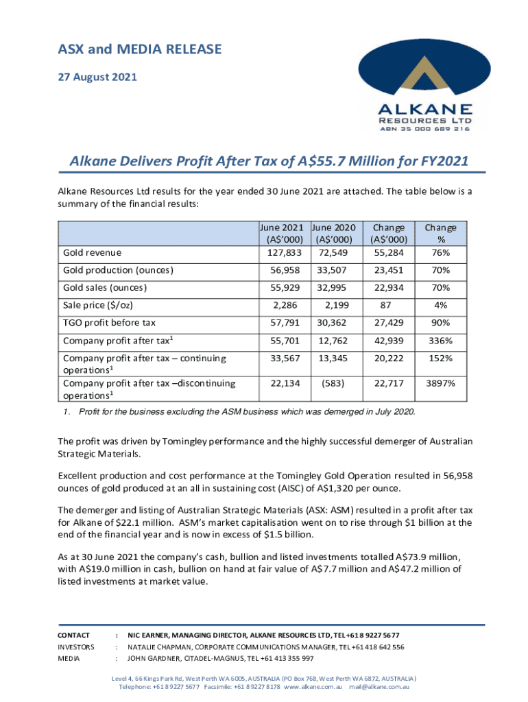 ASX and MEDIA RELEASE 27 August 2021Alkane Delivers Profit After Tax of A$55.7 Million for FY2021 Alkane Resources Ltd results for the year ended 30 June 2021 are attached. The table below is a summary