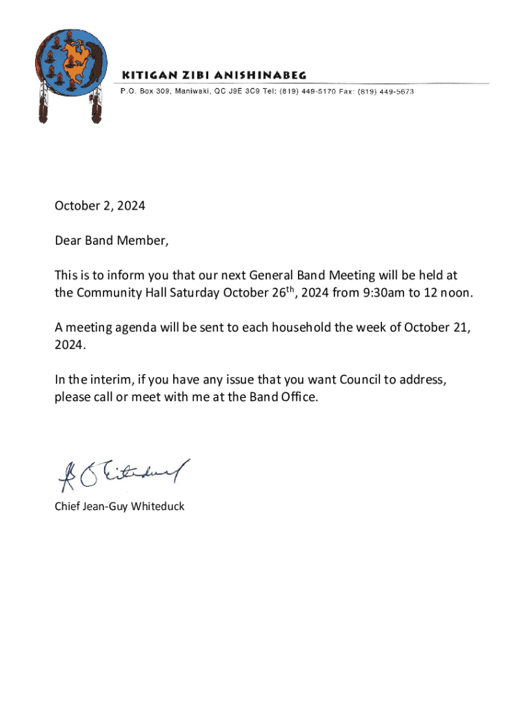 October 2, 2024 Dear Band Member, This is to inform you that our next General Band Meeting will be held at the Community Hall Saturday October 26th, 2024 from 9:30am to 12 noon. A meeting agenda will