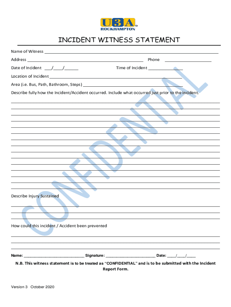 This document serves as a template for collecting witness statements regarding incidents or accidents. It includes sections for the witness\'s information, details about the incident, descriptions of any injuries, and suggestions for prevention. The information provided is to be treated as confidential and is intended for submission alongside an Incident Report Form.