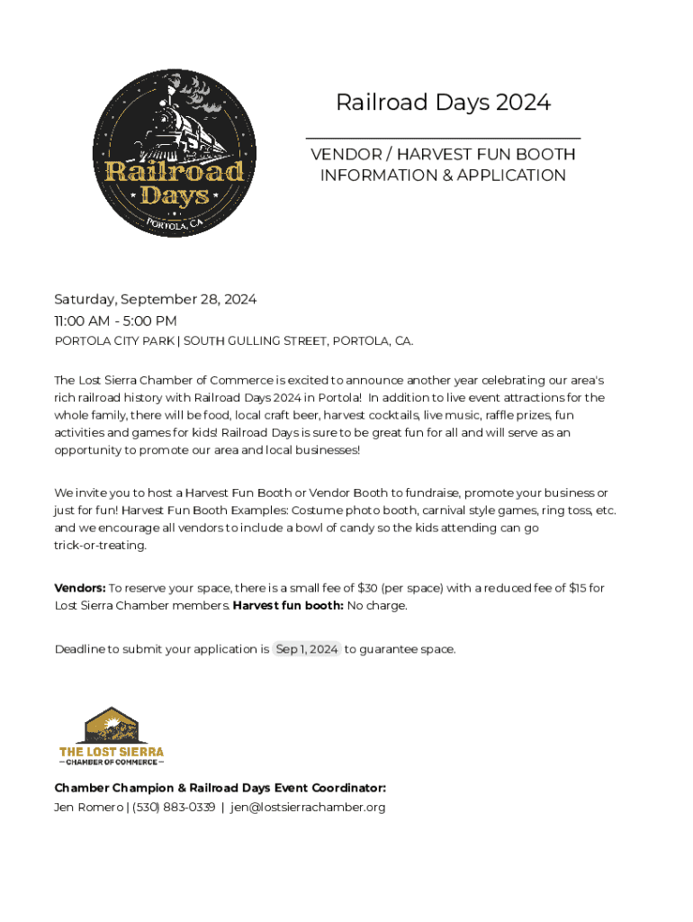 Railroad Days 2024 ___ VENDOR / HARVEST FUN BOOTH INFORMATION & APPLICATIONSaturday, September 28, 2024 11:00 AM 5:00 PM PORTOLA CITY PARK | SOUTH GULLING STREET, PORTOLA, CA. The Lost Sierra Chamber