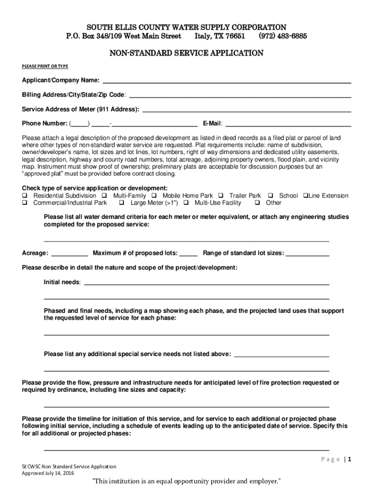 This document serves as an application for non-standard water supply services from the South Ellis County Water Supply Corporation. It outlines the necessary information and criteria required from applicants, including details about the proposed development, service needs, fees, and the application review process.