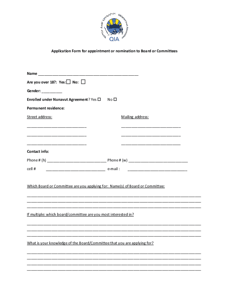 Application Form for appointment or nomination to Board or CommitteesName ___ Are you over 18?: Yes:No:Gender: ___ Enrolled under Nunavut Agreement? Yes No Permanent residence: Street address:Mailing