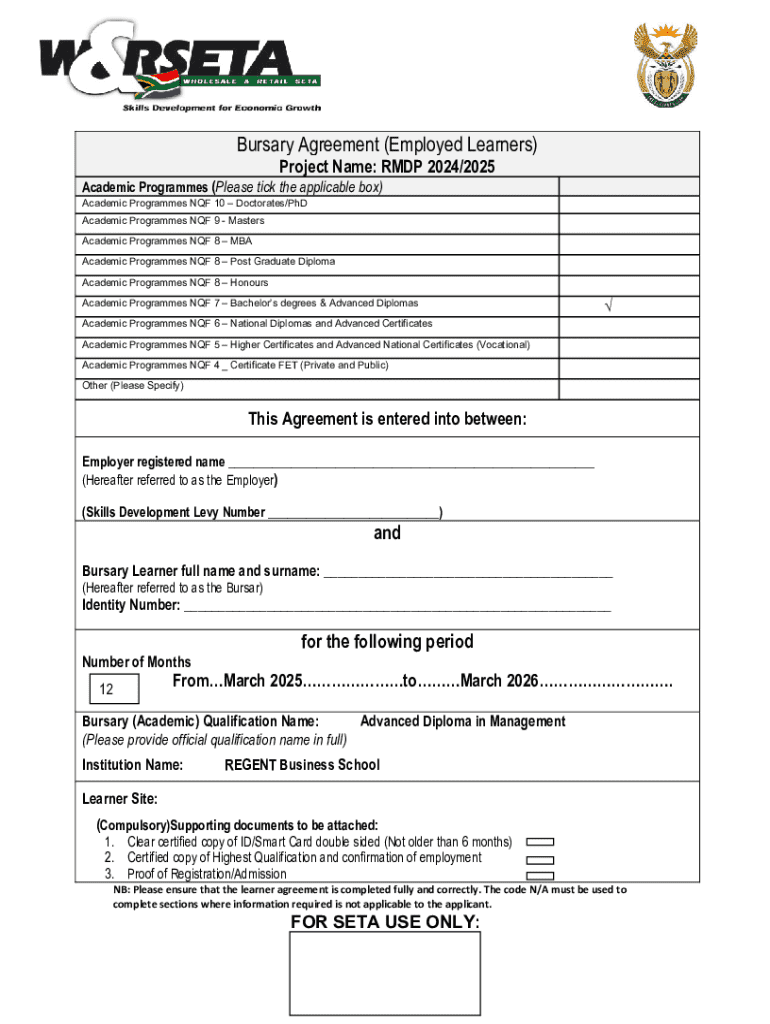 Get the free Bursary Agreement (employed Learners) - regent ac