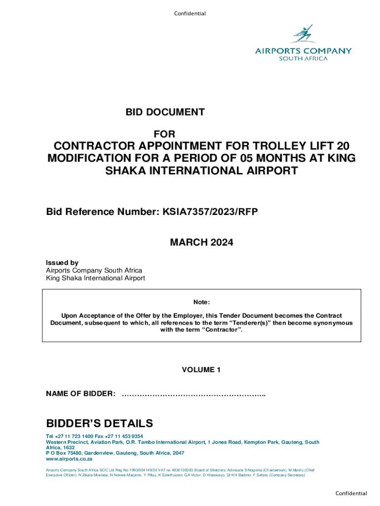 This document outlines the bid process and requirements for the appointment of a contractor to modify Trolley Lift 20 for a duration of five months at King Shaka International Airport. It includes details on tender procedures, essential qualifications, returnable documents, and compliance with procurement regulations.