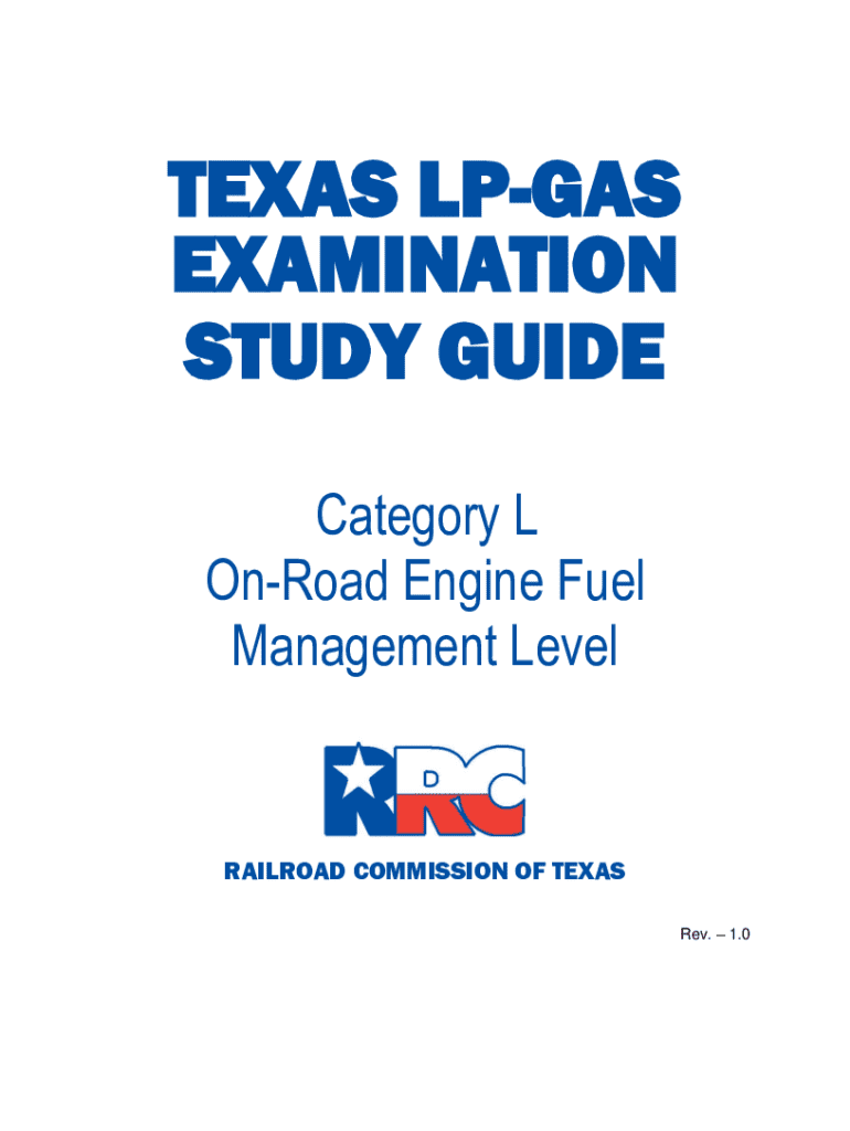 This study guide is designed for individuals preparing for the Railroad Commission of Texas management-level qualifying examination for a Category L On-Road Engine Fuel license. It covers laws and standards related to LP-gas installations and services in Texas, including definitions, operational requirements, examination details, and relevant safety rules.