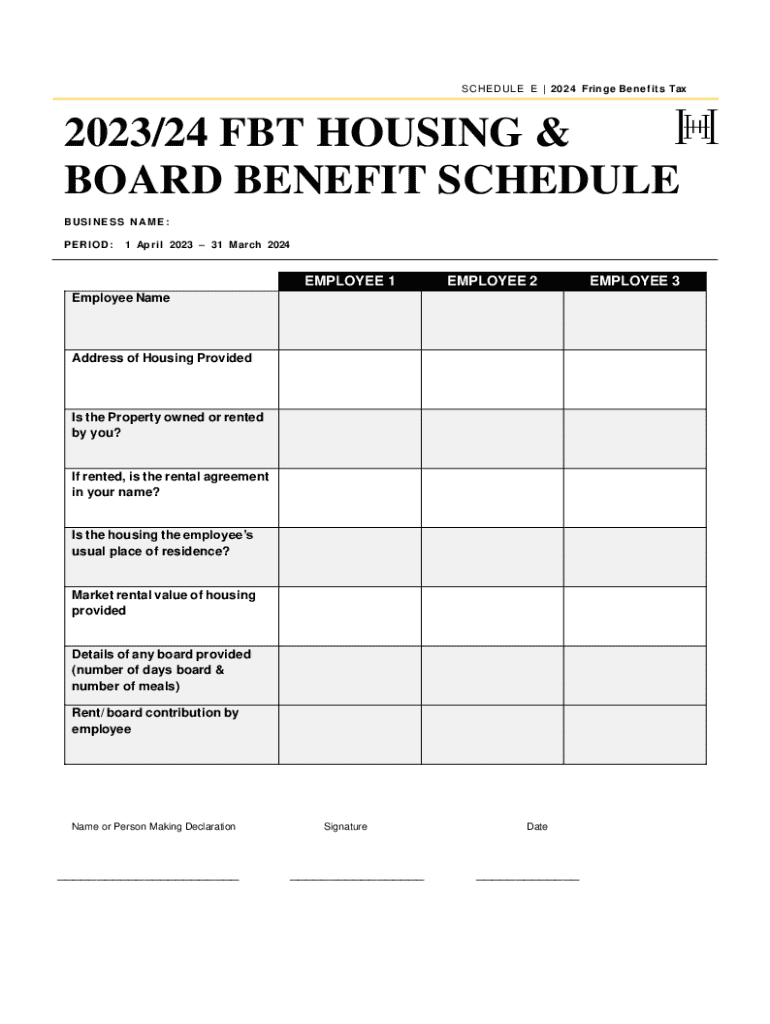 This document outlines the Fringe Benefits Tax (FBT) housing and board benefit schedule for the period from April 1, 2023, to March 31, 2024. It includes sections for employee details, housing arrangements, market rental values, and board provided, along with declaration and signature fields.