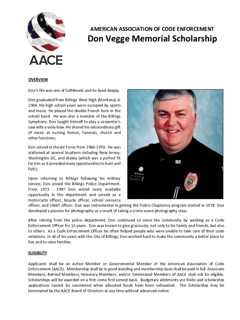 AMERICAN ASSOCIATION OF CODE ENFORCEMENTDon Vegge Memorial ScholarshipOVERVIEW Dons life was one of fulfillment and he lived deeply. Don graduated from Billings West High (Montana) in 1964. His high