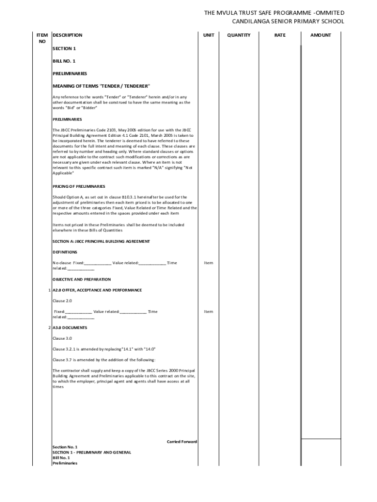 THE MVULA TRUST SAFE PROGRAMME OMMITED CANDILANGA SENIOR PRIMARY SCHOOL ITEM DESCRIPTION NO SECTION 1UNITBILL NO. 1 PRELIMINARIES MEANING OF TERMS \"TENDER / TENDERER\" Any reference to the words