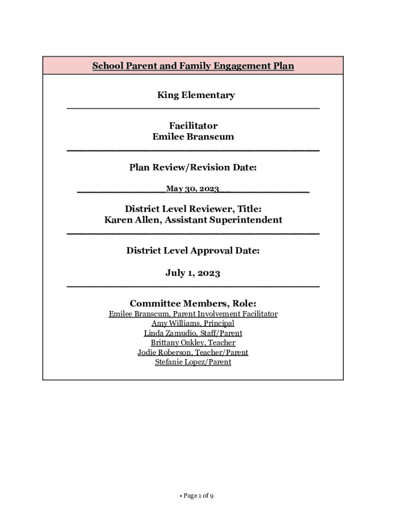 School Parent and Family Engagement Plan King Elementary ___Facilitator Emilee Branscum ___Plan Review/Revision Date: ___May 30, 2023___District Level Reviewer, Title: Karen Allen, Assistant Superintendent