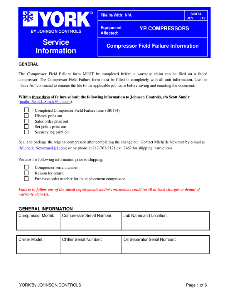 SI0174 REV 312File In/With: N/ABY JOHNSON CONTROLSEquipment Affected:Service InformationYR COMPRESSORSCompressor Field Failure InformationGENERAL The Compressor Field Failure form MUST be completed