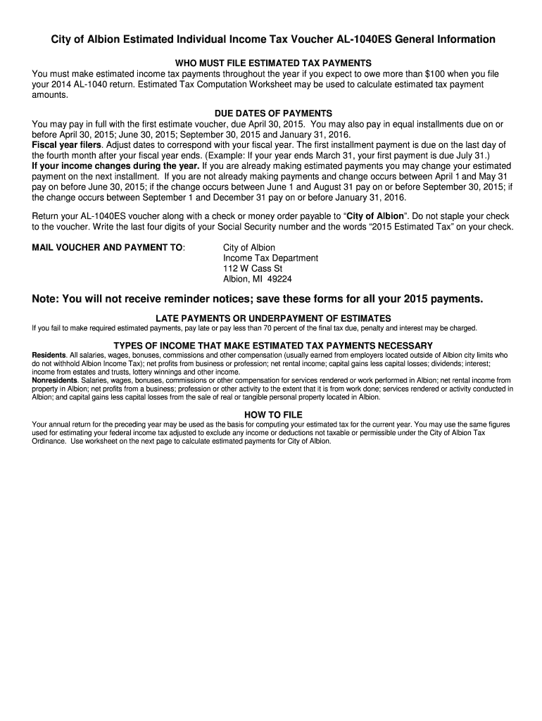 City of Albion Estimated Individual Income Tax Voucher AL-1040ES General Information WHO MUST FILE ESTIMATED TAX PAYMENTS You must make estimated income tax payments throughout the year if you expect