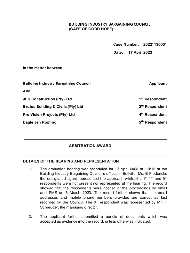 BUILDING INDUSTRY BARGAINING COUNCIL (CAPE OF GOOD HOPE)Case Number: Date:2022113000117 April 2023In the matter betweenBuilding Industry Bargaining CouncilApplicantAnd JLK Construction (Pty) Ltd1st