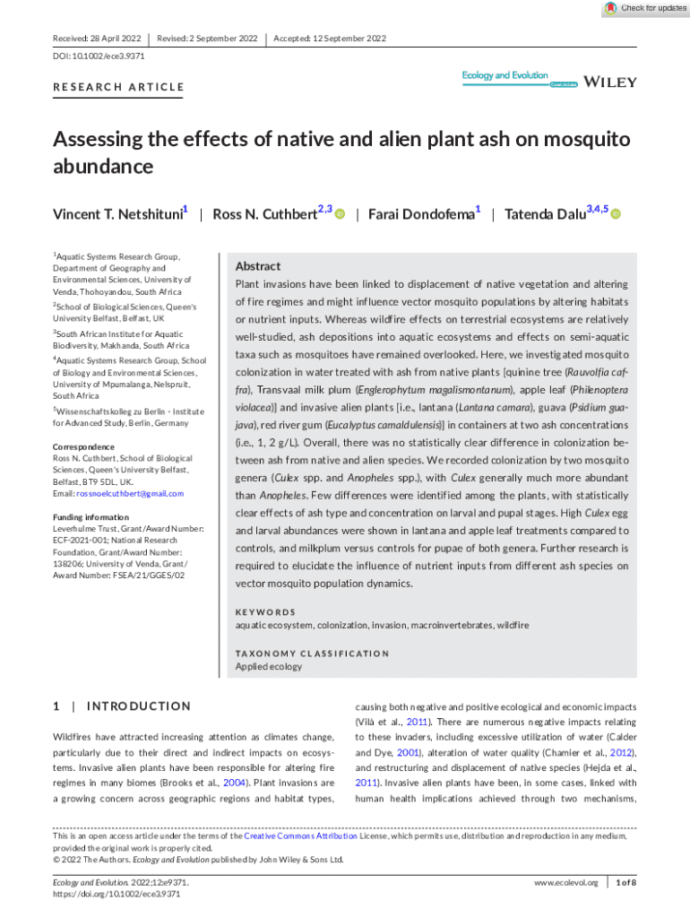Received: 28 April 2022|Revised: 2 September 2022|Accepted: 12 September 2022DOI: 10.1002/ece3.9371RESEARCH ARTICLEAssessing the effects of native and alien plant ash on mosquito abundance Vincent