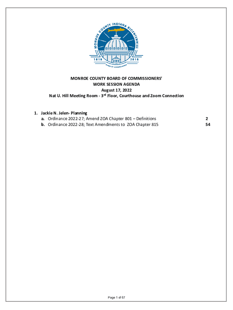 MONROE COUNTY BOARD OF COMMISSIONERS WORK SESSION AGENDA August 17, 2022 Nat U. Hill Meeting Room 3rd Floor, Courthouse and Zoom Connection 1. Jackie N. Jelen Planning a. Ordinance 202227; Amend ZOA