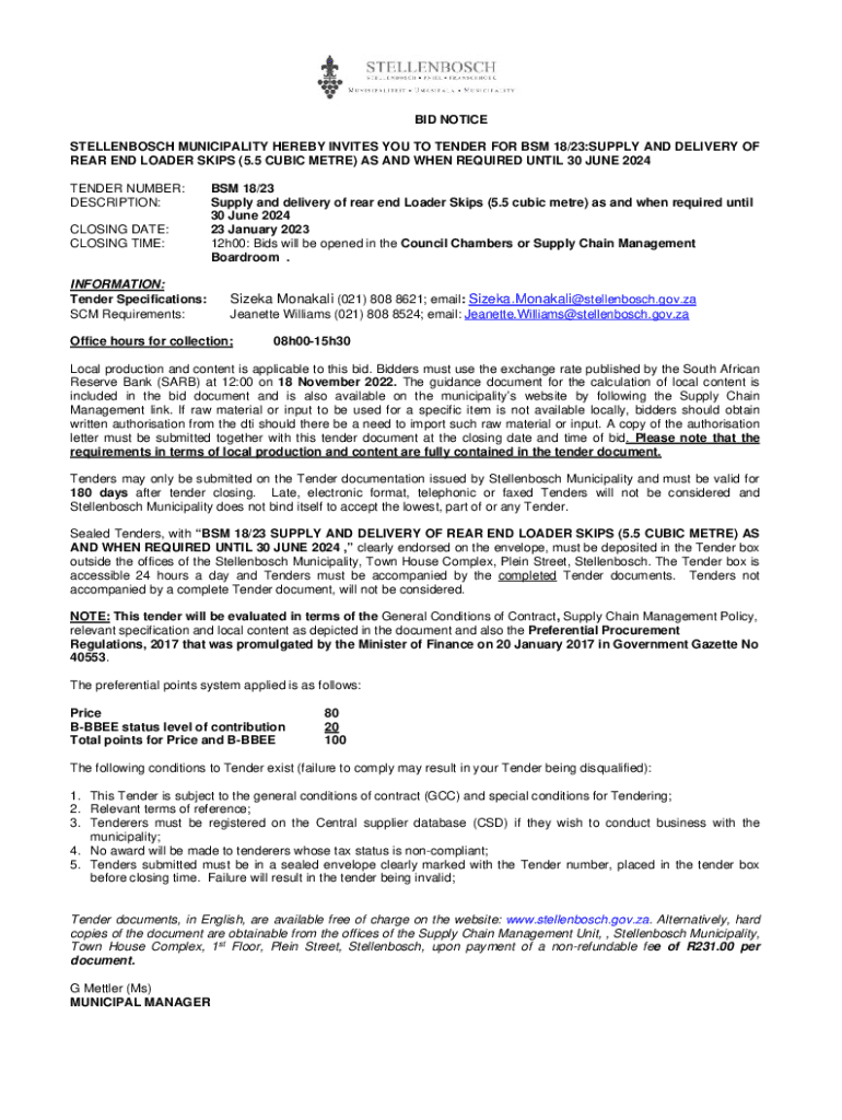 BID NOTICE STELLENBOSCH MUNICIPALITY HEREBY INVITES YOU TO TENDER FOR BSM 18/23:SUPPLY AND DELIVERY OF REAR END LOADER SKIPS (5.5 CUBIC METRE) AS AND WHEN REQUIRED UNTIL 30 JUNE 2024 TENDER NUMBER: