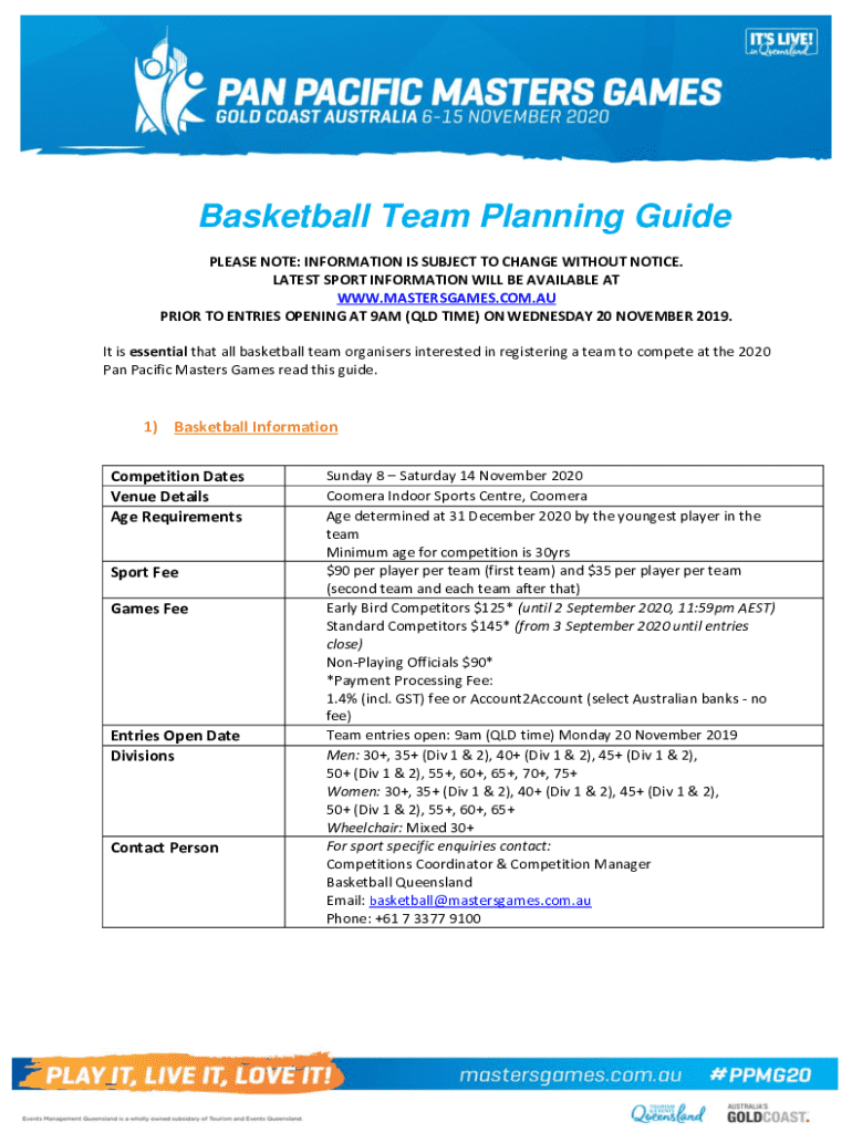 This guide provides essential information for basketball team organisers participating in the 2020 Pan Pacific Masters Games, including competition dates, venue details, age requirements, and registration procedures.