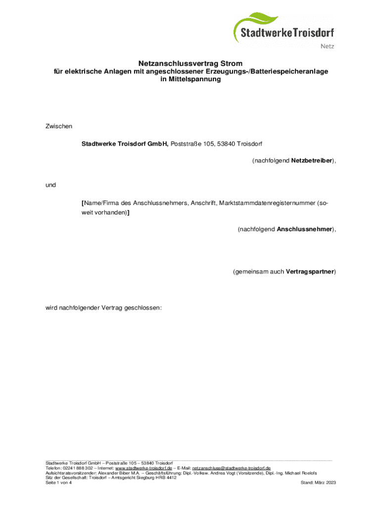Netzanschlussvertrag Strom fr elektrische Anlagen mit angeschlossener Erzeugungs/Batteriespeicheranlage in MittelspannungZwischen Stadtwerke Troisdorf GmbH, Poststrae 105, 53840 Troisdorf (nachfolgend