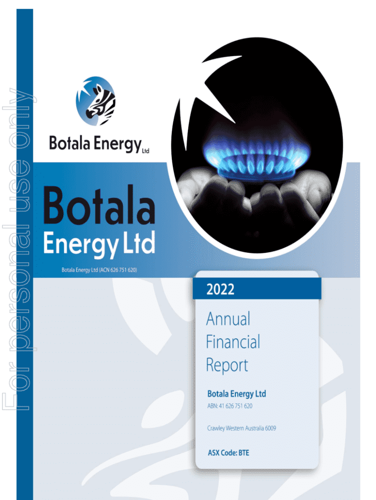 This document presents the Annual Report of Botala Energy Ltd, covering its exploration and development activities for the financial year ending June 30, 2022. It includes a letter from the Chairman, financial statements, and an overview of the company\'s principal activities, highlighting its coal bed methane (CBM) project in Botswana and renewable energy initiatives.