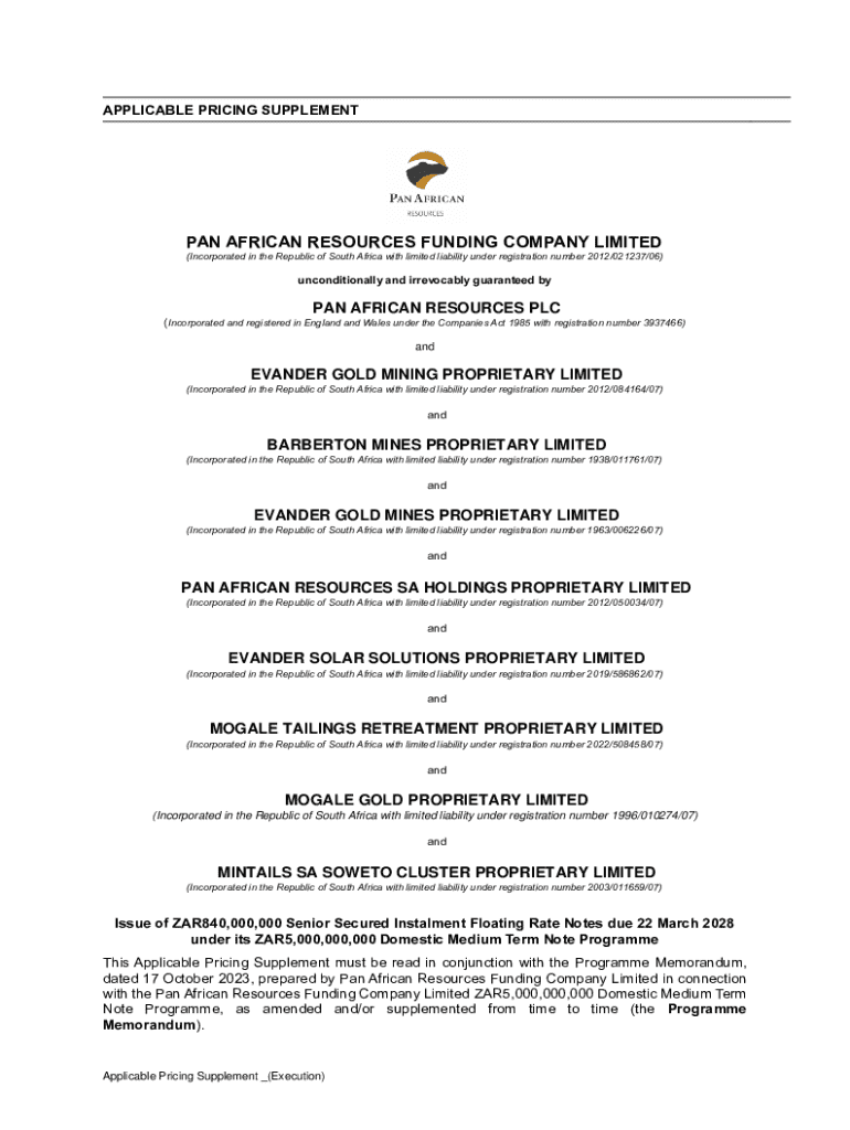 APPLICABLE PRICING SUPPLEMENTPAN AFRICAN RESOURCES FUNDING COMPANY LIMITED (Incorporated in the Republic of South Africa with limited liability under registration number 2012/021237/06)unconditionally