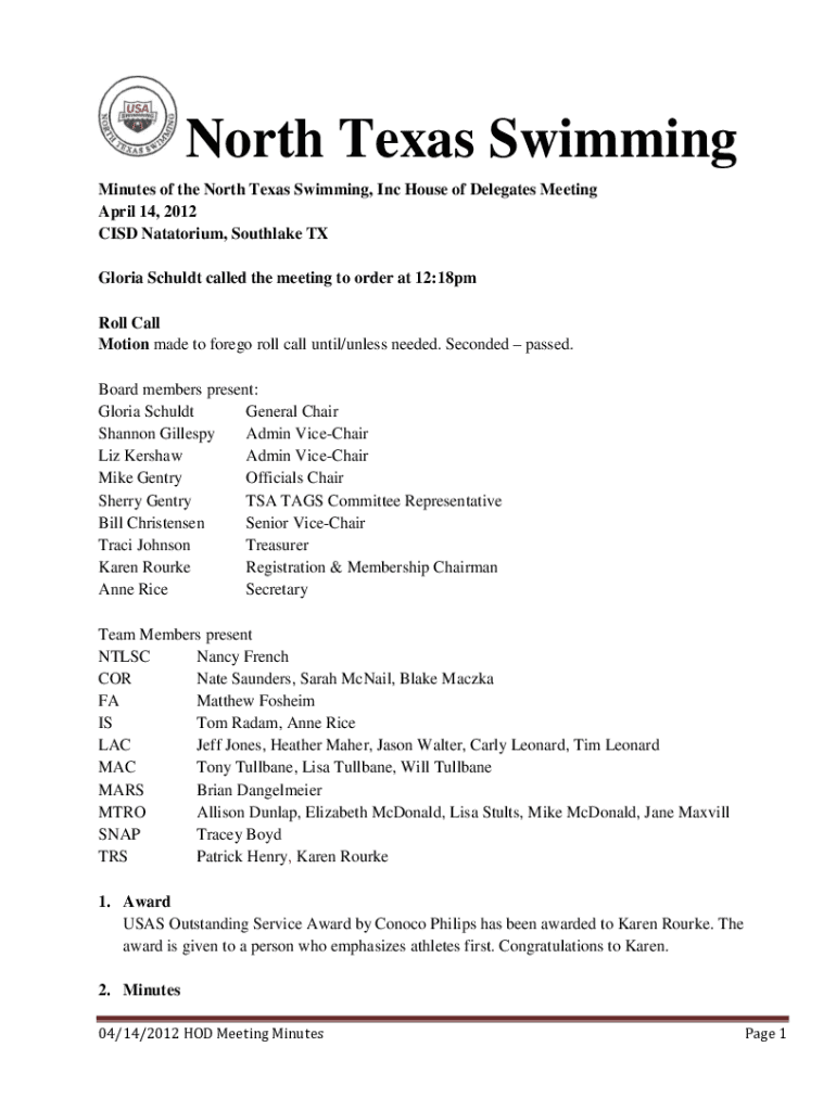 North Texas Swimming Minutes of the North Texas Swimming, Inc House of Delegates Meeting April 14, 2012 CISD Natatorium, Southlake TX Gloria Schuldt called the meeting to order at 12:18pm Roll Call
