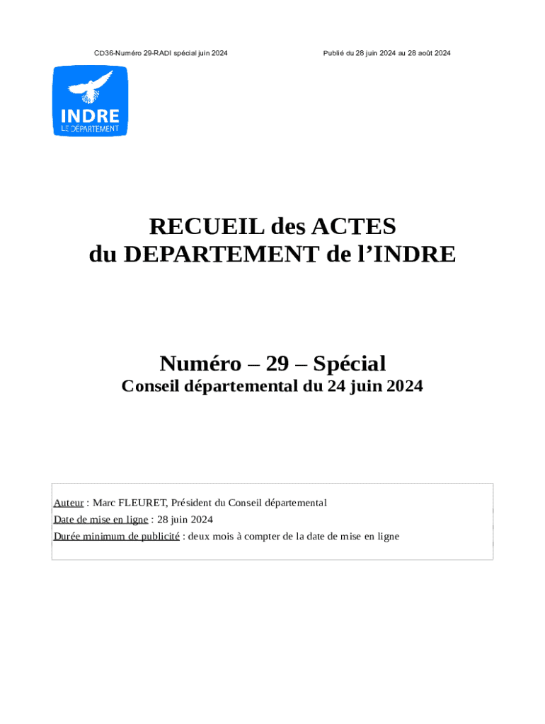 CD36Numro 29RADI spcial juin 2024Publi du 28 juin 2024 au 28 aot 2024RECUEIL des ACTES du DEPARTEMENT de lINDRENumro 29 Spcial Conseil dpartemental du 24 juin 2024Auteur : Marc FLEURET, Prsident du