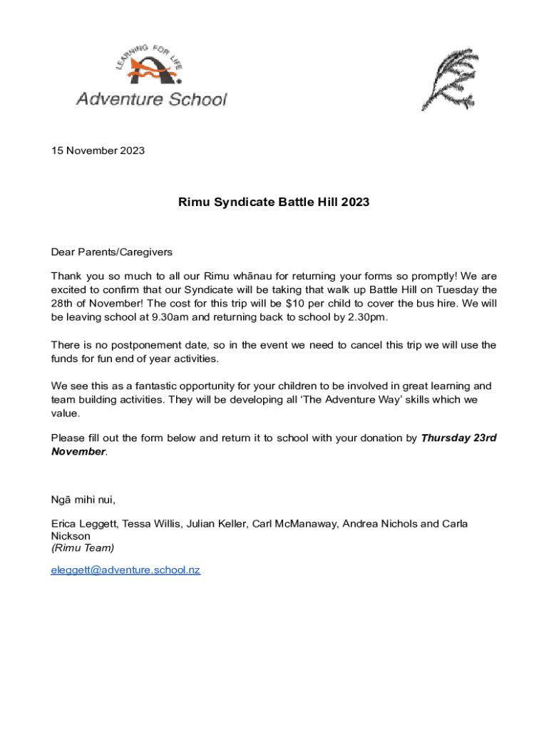 This document provides essential details for parents and caregivers regarding the Rimu Syndicate\'s planned walk to Battle Hill, including permission slips, donation information, and important dates related to the trip.