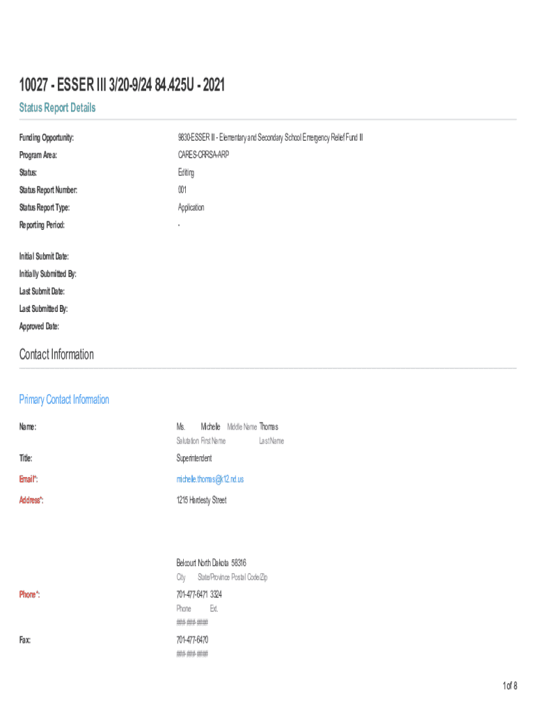 This document is a status report detailing the application and implementation plan for the Elementary and Secondary School Emergency Relief Fund III (ESSER III) for Belcourt School District #7. It captures stakeholder consultations, funding utilization, and strategies to address learning loss and supports for underserved populations, particularly in the context of the COVID-19 pandemic.