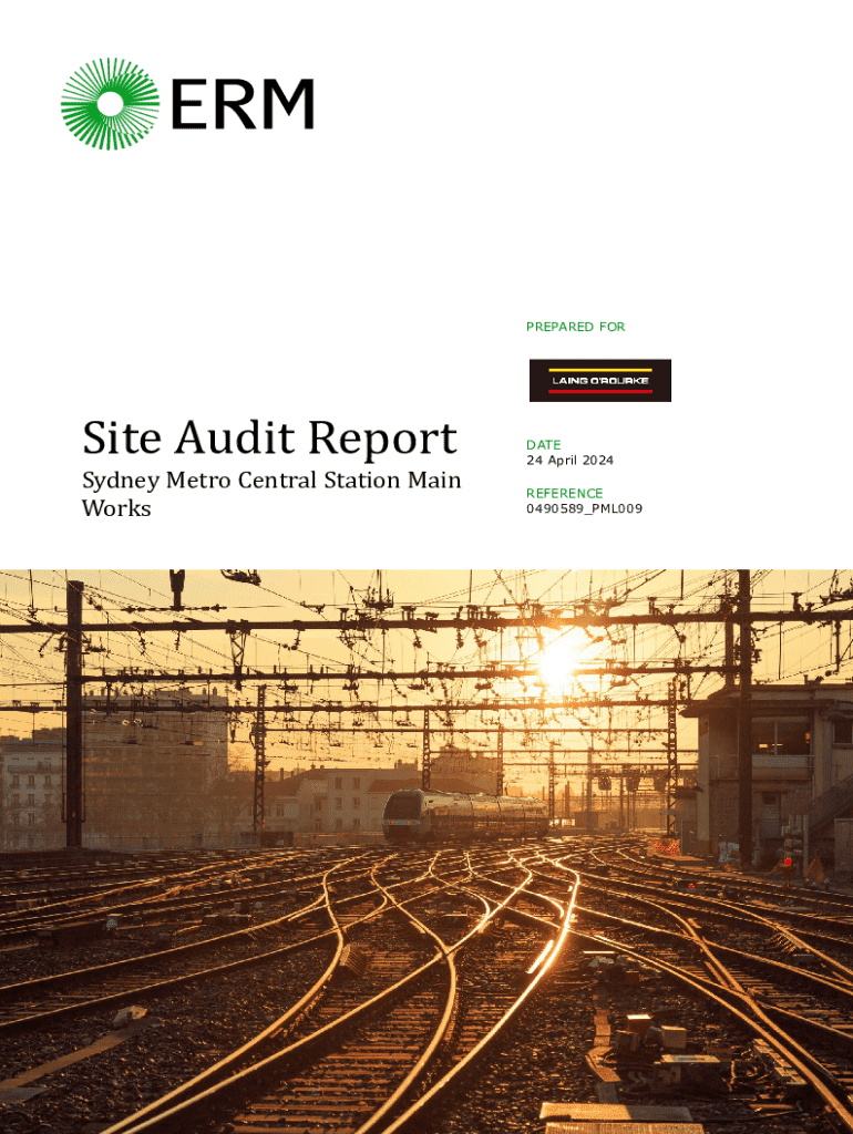 This report provides a comprehensive site audit of the Sydney Metro Central Station Main Works, focusing on the environmental assessment and remediation of contaminated areas associated with the construction of the Metro Station Box and the Central Walk and Eastern Entrance. It includes findings regarding soil, groundwater, waste management, and compliance with regulatory guidelines, ensuring the site is suitable for railway and associated public transport infrastructure use.