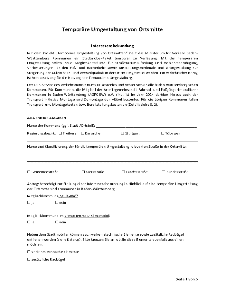Temporre Umgestaltung von Ortsmitte Interessensbekundung Mit dem Projekt Temporre Umgestaltung von Ortsmitten stellt das Ministerium fr Verkehr BadenWrttemberg Kommunen ein StadtmbelPaket temporr