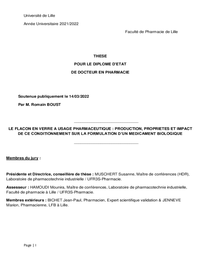 Universit de Lille Anne Universitaire 2021/2022 Facult de Pharmacie de LilleTHESE POUR LE DIPLOME D\'ETAT DE DOCTEUR EN PHARMACIESoutenue publiquement le 14/03/2022 Par M. Romain BOUST___ LE FLACON