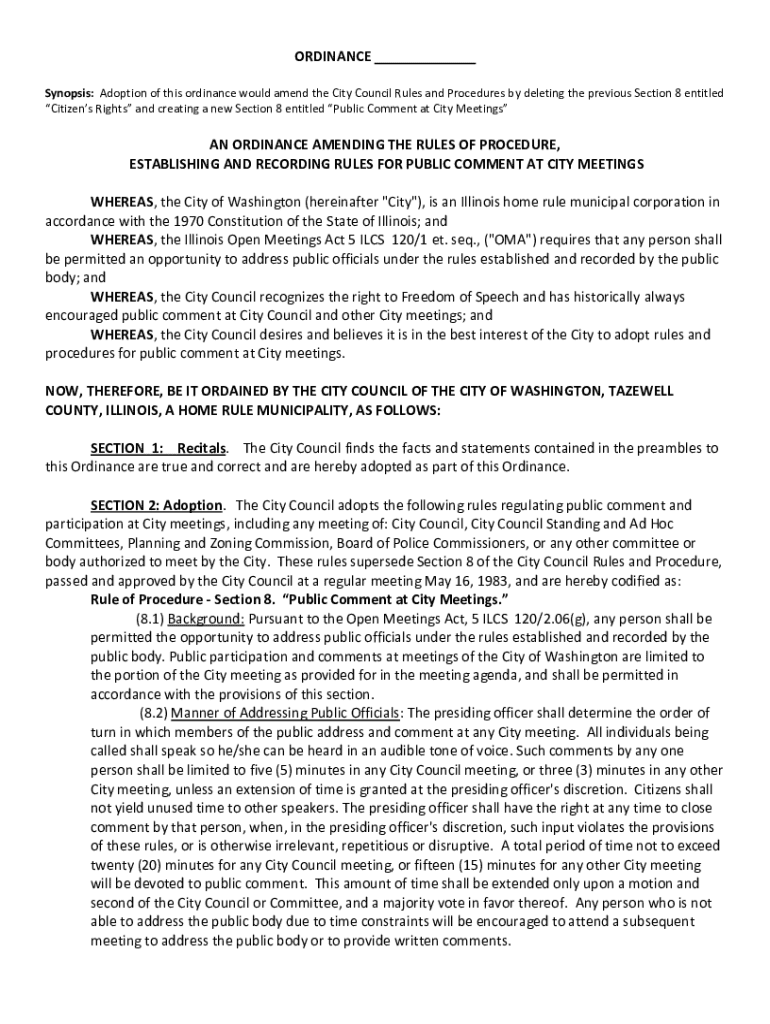 ORDINANCE Synopsis: Adoption of this ordinance would amend the City Council Rules and Procedures by deleting the previous Section 8 entitled Citizens Rights and creating a new Section 8 entitled Public