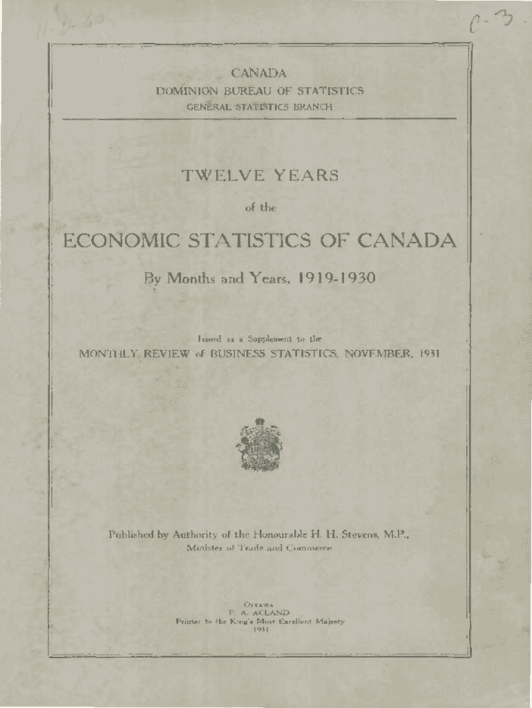 CANADA DOMINION BUREAU OF STATISTICS GENERAL STATISTICS BRANCHTWELVE YEARS of theECONOMIC STATISTICS OF CANADA By Months and Years, 19191930Issued as a Supplement to theMONTHLY REVIEW of BUSINESS