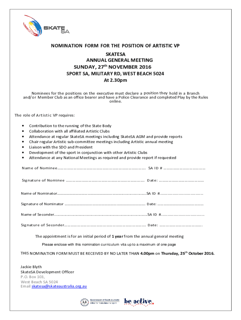 NOMINATION FORM FOR THE POSITION OF ARTISTIC VP SKATESA ANNUAL GENERAL MEETING SUNDAY, 27th NOVEMBER 2016 SPORT SA, MILITARY RD, WEST BEACH 5024 At 2.30pm Nominees for the positions on the executive