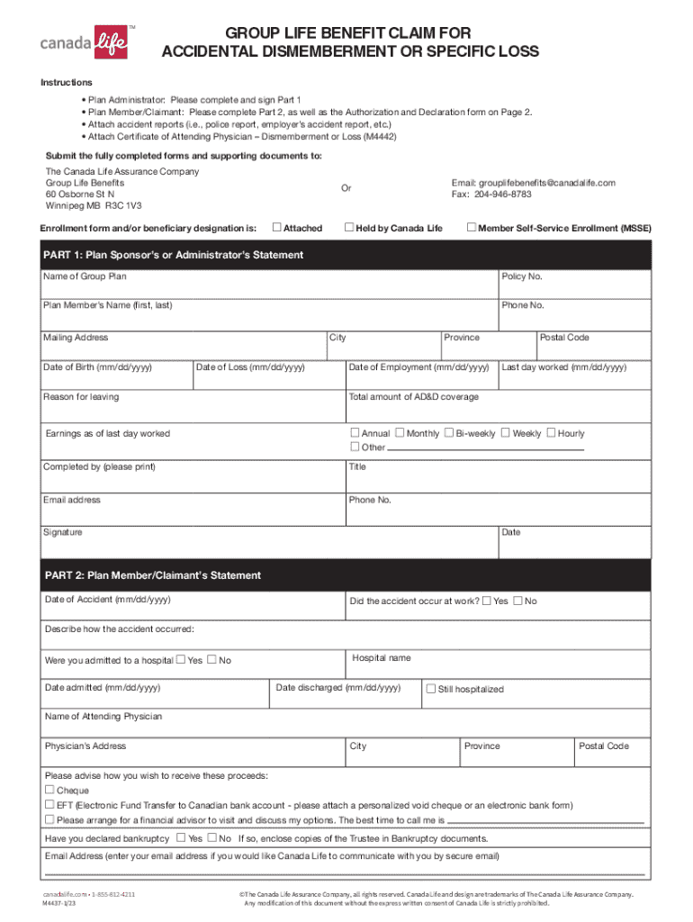 This document serves as a claim form for group life benefits related to accidental dismemberment or specific loss. It includes sections for the plan administrator and the plan member/claimant to provide necessary information, supporting documents, and authorizations. The form outlines the submission process to Canada Life and emphasizes the importance of privacy and personal information management.