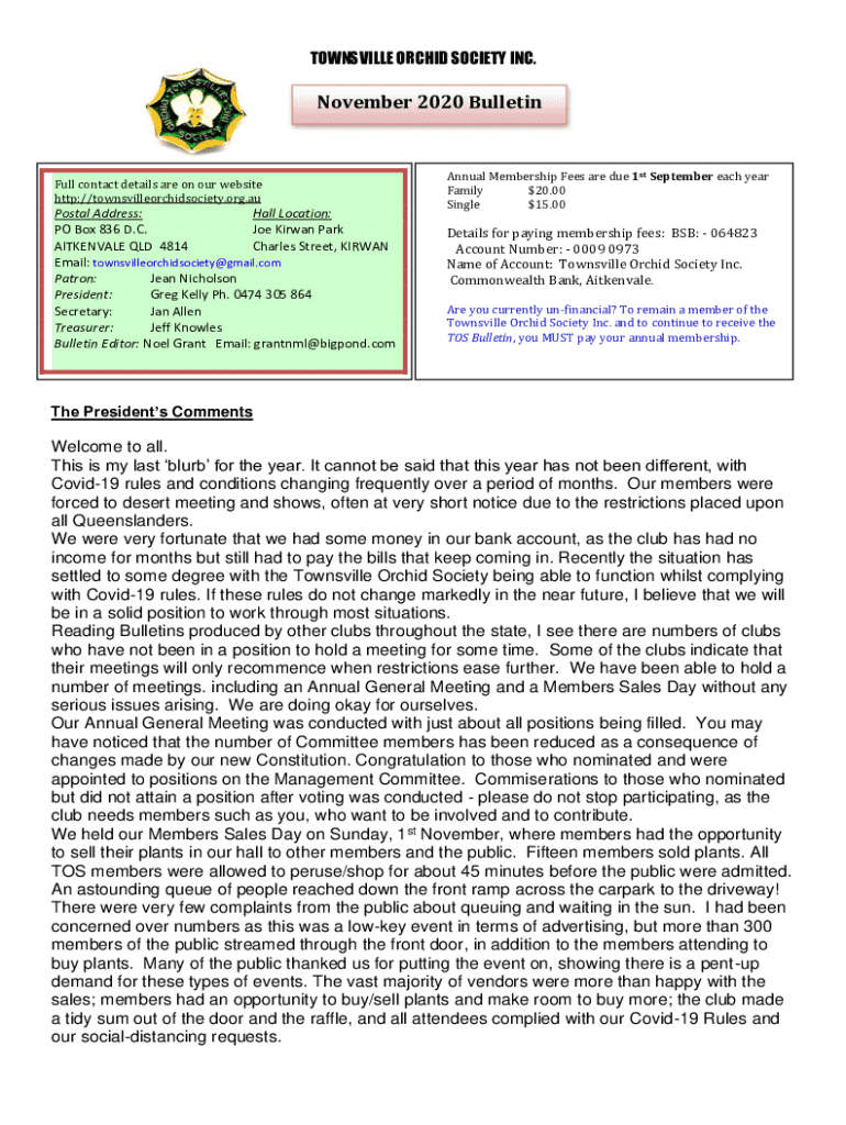 This bulletin from the Townsville Orchid Society Inc. outlines membership details, the President\'s comments on the year\'s events particularly relating to Covid-19, updates on meetings and activities conducted by the society, and provides information on plant competitions and sales days. It also includes minutes from management and general meetings, including membership applications and financial reports.