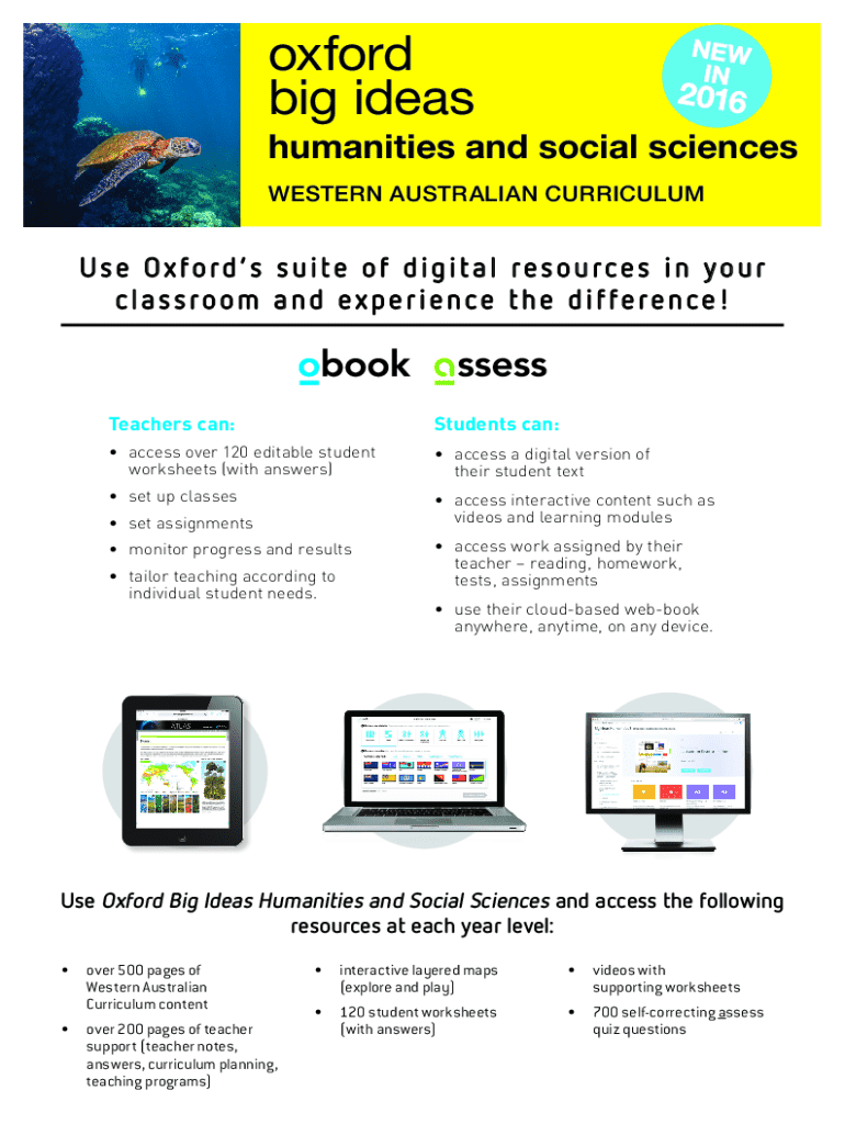 This order form facilitates the purchase of the Oxford Big Ideas resources specifically designed for the Western Australian Curriculum in Humanities and Social Sciences. It outlines available print and digital options for student and teacher materials, including worksheets, assessments, and curriculum support.