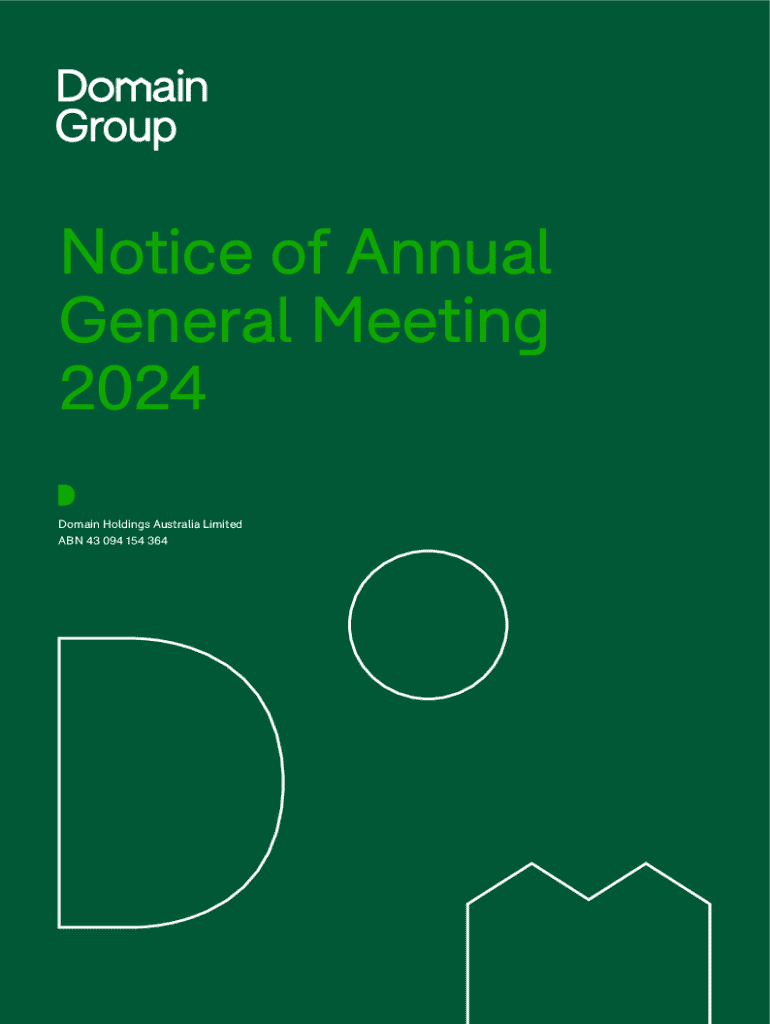 This document provides notice of the Annual General Meeting (AGM) of Domain Holdings Australia Limited to be held on November 6, 2024. It includes the agenda, resolutions to be voted on, key dates, and details on how shareholders can participate and vote.