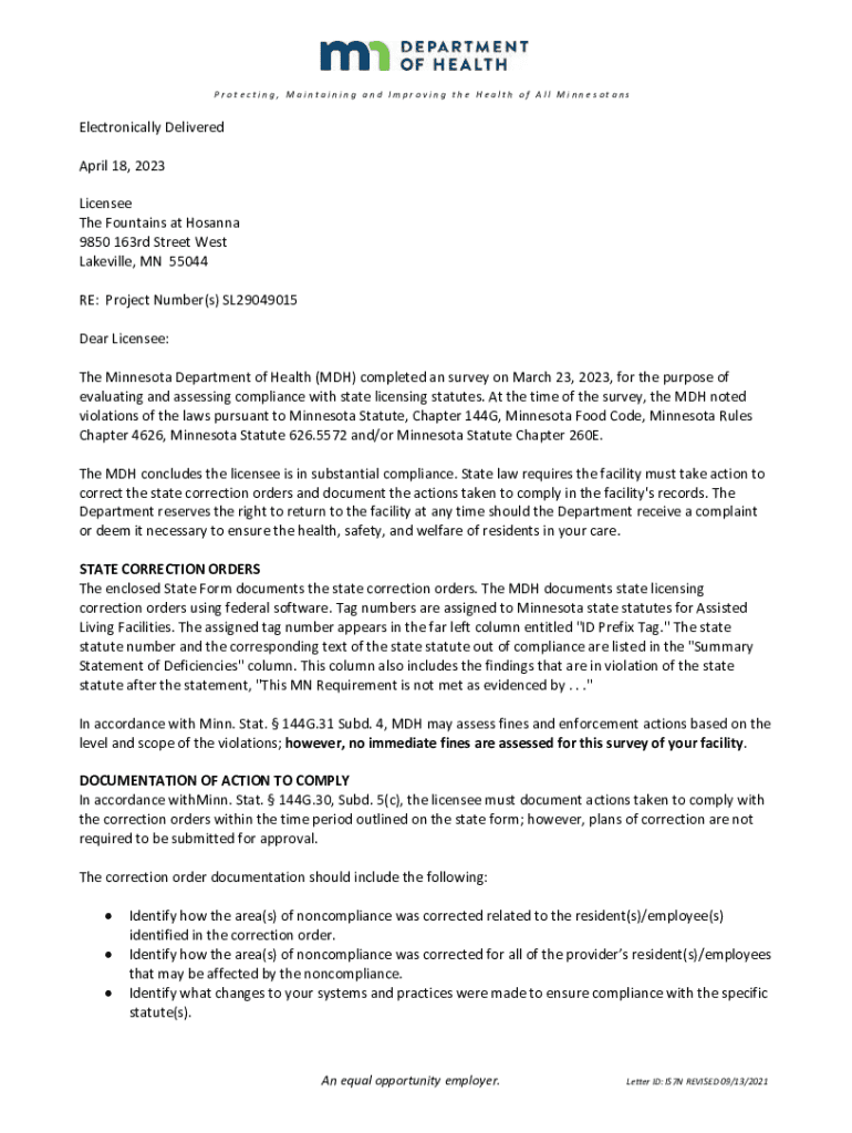 Protecting, Maintaining and Improving the Health of All MinnesotansElectronically Delivered April 18, 2023 Licensee The Fountains at Hosanna 9850 163rd Street West Lakeville, MN 55044 RE: Project
