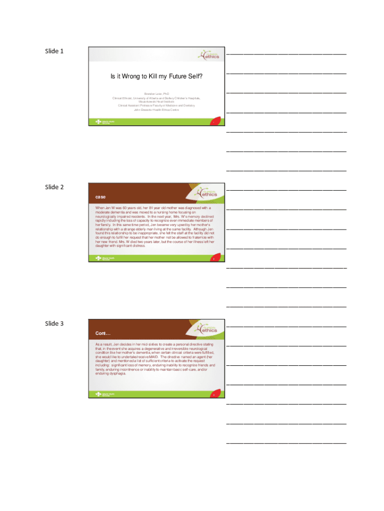 Slide 1___ ___Is it Wrong to Kill my Future Self?___Brendan Leier, PhD Clinical Ethicist, University of Alberta and Stollery Childrens Hospitals, Mazankowski Heart Institute Clinical Assistant Professor