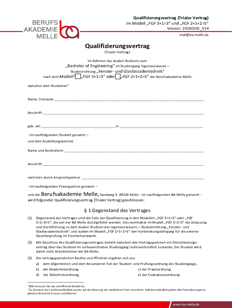 Qualifizierungsvertrag (Trialer Vertrag) im Modell FGF 3+13 und FGF 2+1+25 Version: 20180205_V14 mail@bamelle.deVorwort zu diesem Vertrag1 Herzlich Willkommen an der Berufsakademie Melle. Sie haben