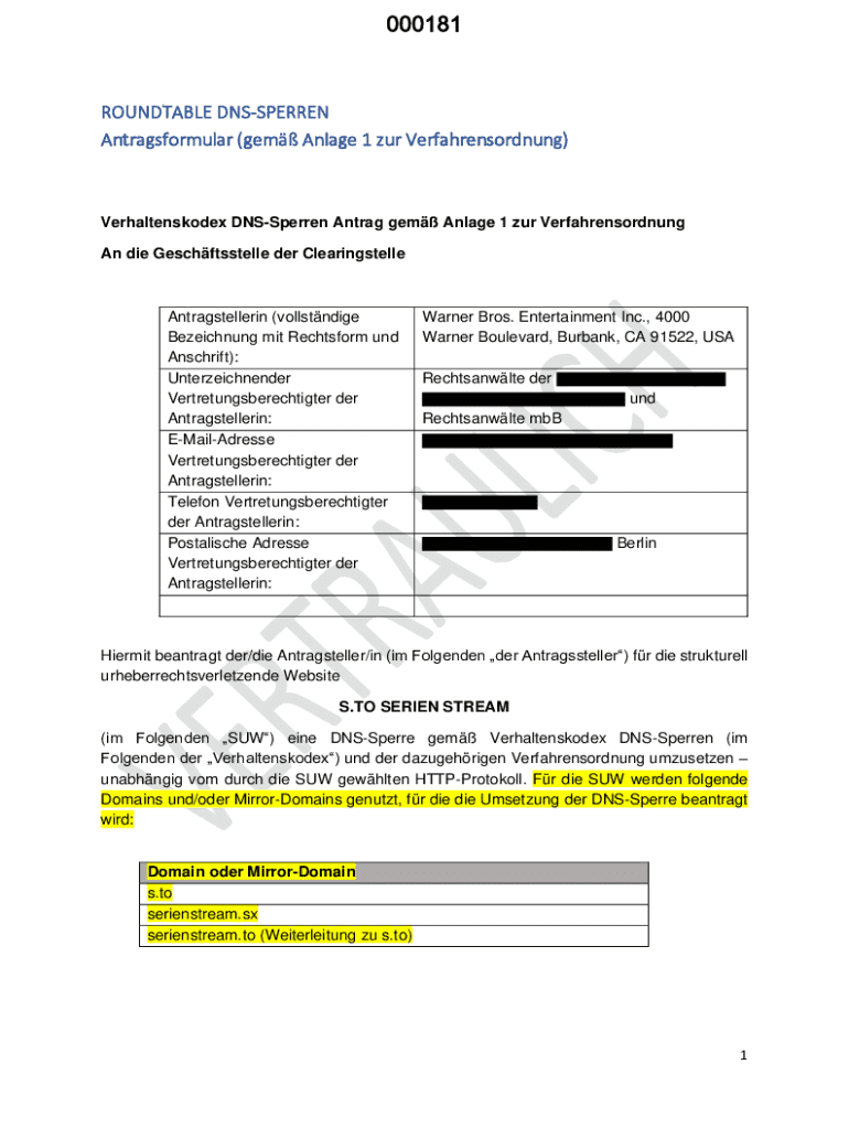000181ROUNDTABLE DNSSPERREN Antragsformular (gem Anlage 1 zur Verfahrensordnung)Verhaltenskodex DNSSperren Antrag gem Anlage 1 zur Verfahrensordnung An die Geschftsstelle der ClearingstelleAntragstellerin