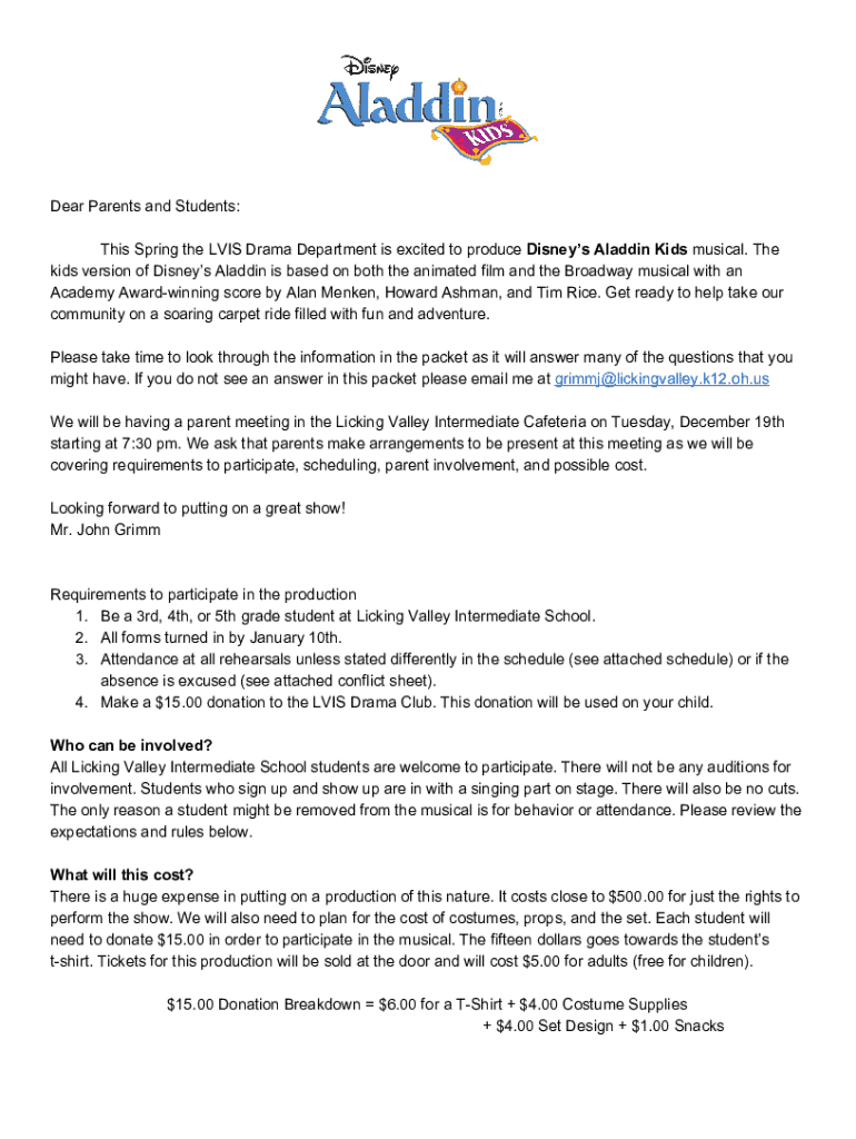 This packet provides essential information for parents and students participating in the Licking Valley Intermediate School\'s production of Disney\'s Aladdin Kids. It includes details about the requirements for participation, meeting dates, donation information, attendance policies, and how families can contribute to the production\'s success.