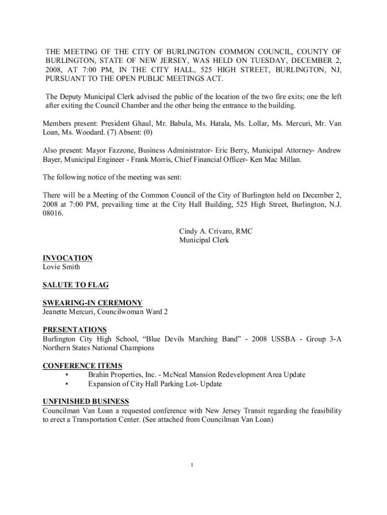 THE MEETING OF THE CITY OF BURLINGTON COMMON COUNCIL, COUNTY OF BURLINGTON, STATE OF NEW JERSEY, WAS HELD ON TUESDAY, DECEMBER 2, 2008, AT 7:00 PM, IN THE CITY HALL, 525 HIGH STREET, BURLINGTON, NJ,
