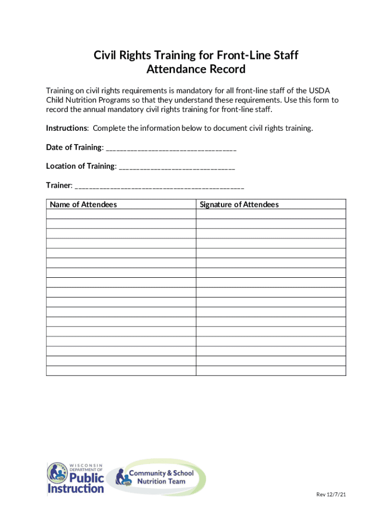 This document is an attendance record form used to document the mandatory civil rights training for front-line staff in the USDA Child Nutrition Programs. It includes sections for the date, location, trainer, and signatures of attendees to ensure compliance with civil rights requirements.