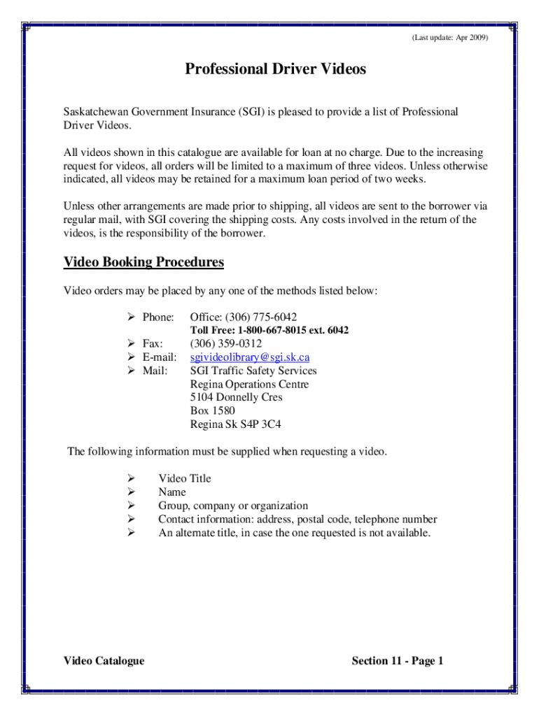 (Last update: Apr 2009)Professional Driver Videos Saskatchewan Government Insurance (SGI) is pleased to provide a list of Professional Driver Videos. All videos shown in this catalogue are available