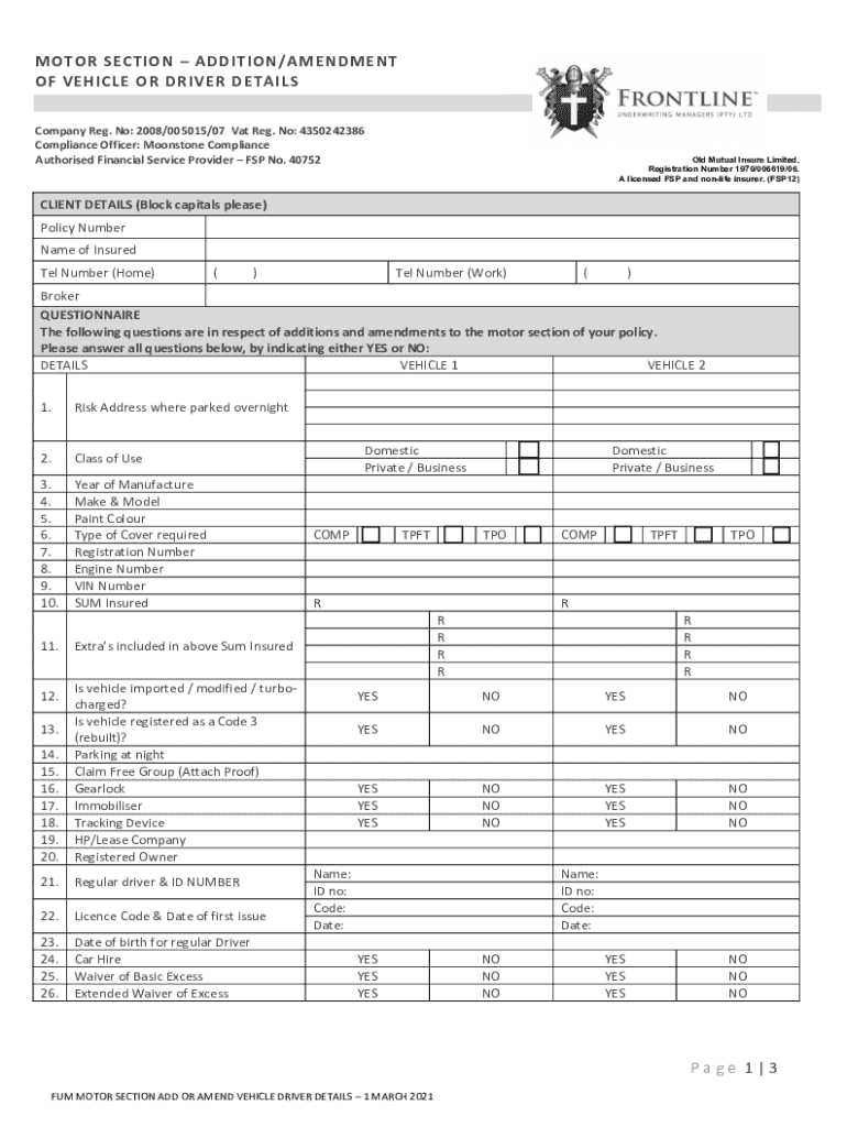 MOTOR SECTION ADDITION/AMENDMENT OF VEHICLE OR DRIVER DETAILS Company Reg. No: 2008/005015/07 Vat Reg. No: 4350242386 Compliance Officer: Moonstone Compliance Authorised Financial Service Provider